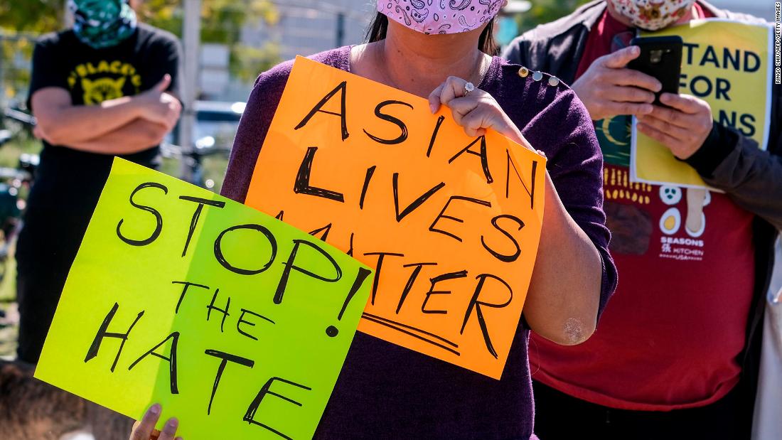 Demonstrators wearing face masks and holding signs take part in a rally to raise awareness of anti-Asian violence, near Chinatown in Los Angeles, California, on February 20, 2021. – The rally was organized in response to last month’s fatal assault of Vicha Ratanapakdee, an 84-year-old immigrant from Thailand, in San Francisco. (Photo by RINGO CHIU / AFP) (Photo by RINGO CHIU/AFP via Getty Images)
